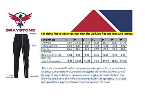Concealed Carry women's Compression Spandex leggings, a great alternative to other IWB concealment options. Graystone’s leggings feature specially designed front and back pockets for easy access and reach. A must have product in your holster weapon clothing wardrobe. GraystoneCCW compression wear is made with a special MicroPoly/Spandex blend. This fabric is a durable cooling material that hugs more closely than standard polyester knits or cotton clothing. Each piece compresses, lifts and shapes while securing your weapon and giving you freedom of movement. Our team is dedicated to customer satisfaction. We have taken your input and improved our sizing chart. GraystoneCCW compression wear line includes tanks, Tshirts, shorts, shirts for men and women. Click on the ‘’ADD TO CART’’ and get yours today. 100% guarantee that you are satisfied with your holster leggings or receive your money back no questions asked. Available in Black, Camouflage, White. Machine washable. This is a compression garment use sizing chart for best fit